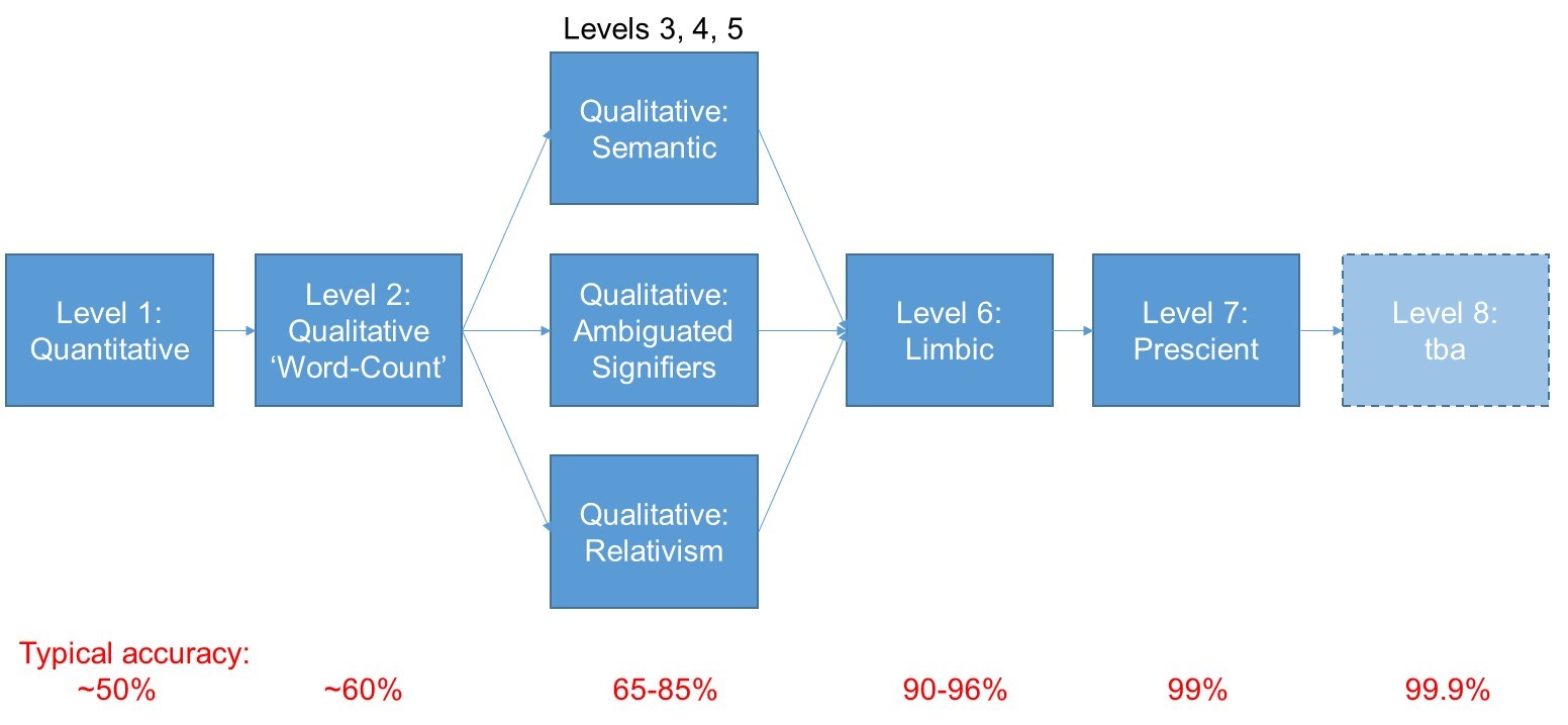 By the time you’ve reached Level 5, you’ve eliminated almost every one of the BDA providers on the planet. If you try and look beyond this level, you’re basically left with PanSensics. The start point, in fact, for the PanSensic development was the recognition that a lot of what people say has very little to do with their subsequent behavior. Per the J.P. Morgan aphorism, ‘people make decisions for two reasons, good reasons and real reasons’. Making use of ambiguated signifiers is a useful first step towards capturing the behavior-driving ‘real’ reasons, but the real step change in this direction only occurs when the analytics capability becomes specifically focused on capturing what comes from our limbic brain rather than from our rationalising pre-frontal cortex (PFC). Level 6 BDA is thus all about ‘reading between the lines’ of narrative input to listen to what is coming from our limbic brain. Our JupiterMu metaphor-scraping engine represents a good example of what this Level 6 capability is all about: when you ask a consumer what they think about a product, their rationalizing PFC is hard at work trying to disguise what is happening in the limbic brain. Generally speaking the PFC works fast enough to be able to construct a reasonably coherent set of reasons why we do or don’t like something. Our PFC, on the other hand, is not fast enough to massage and re-engineer the metaphors we use, and so a BDA engine that is tuned to extract and analyse metaphor content is much more likely to capture what’s happening in our behavior-driving limbic brain. In effect, the entire PanSensic research programme has been about tapping in to all of the various different ways to capture limbic-brain content.