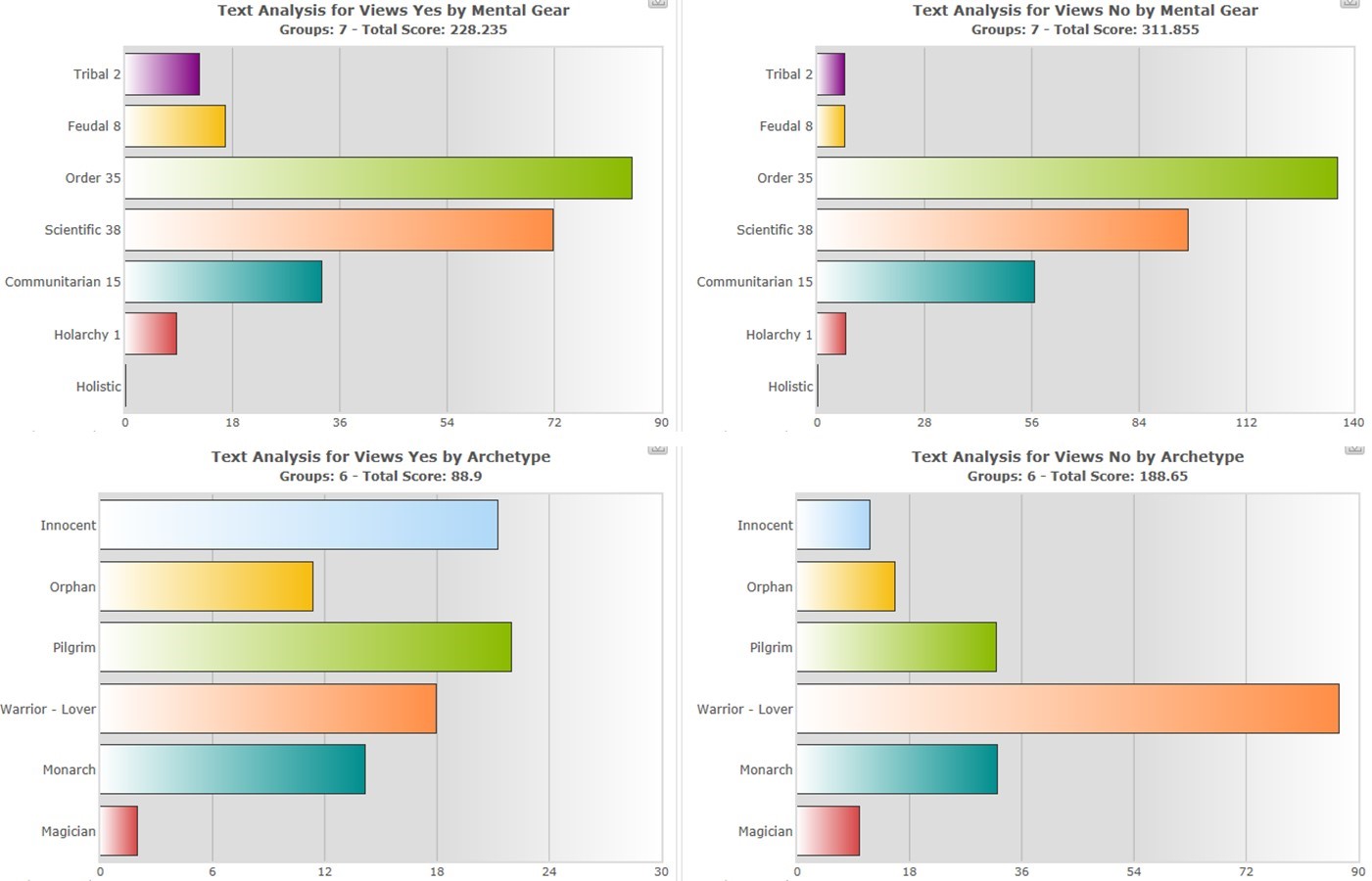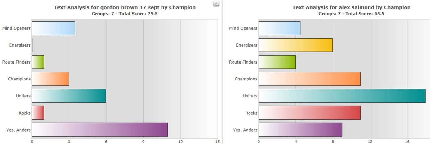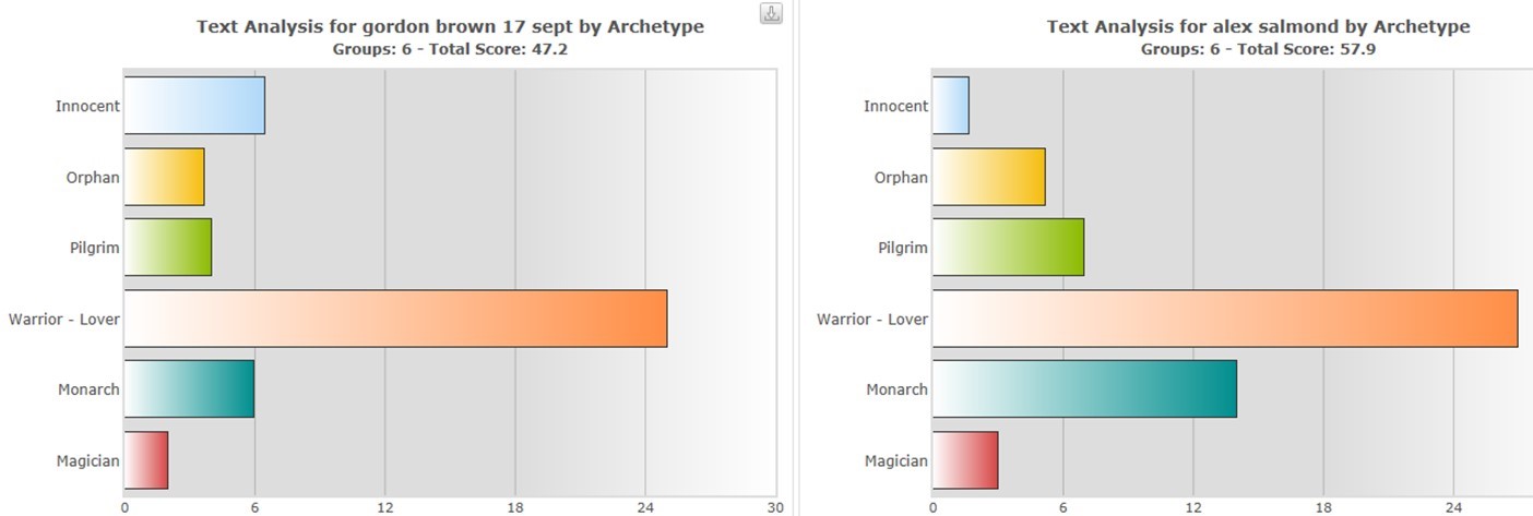 We can see a similar focus characteristic when we look at the Brown and Salmond words through another PanSensic lens, this time looking at emotional archetypes. As we might expect, both featured the ‘warrior/lover’ archetype strongly. But while Brown’s speech was almost exclusively speaking from this archetype, Salmond may well have blurred his position by also speaking from a ‘Monarch’ stance: