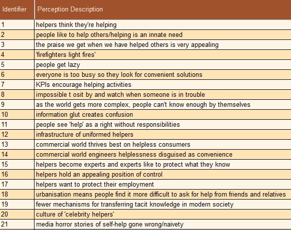 As usual, the start point was to define a question. In this case it was: ‘a culture of learned helplessness has arisen because…’