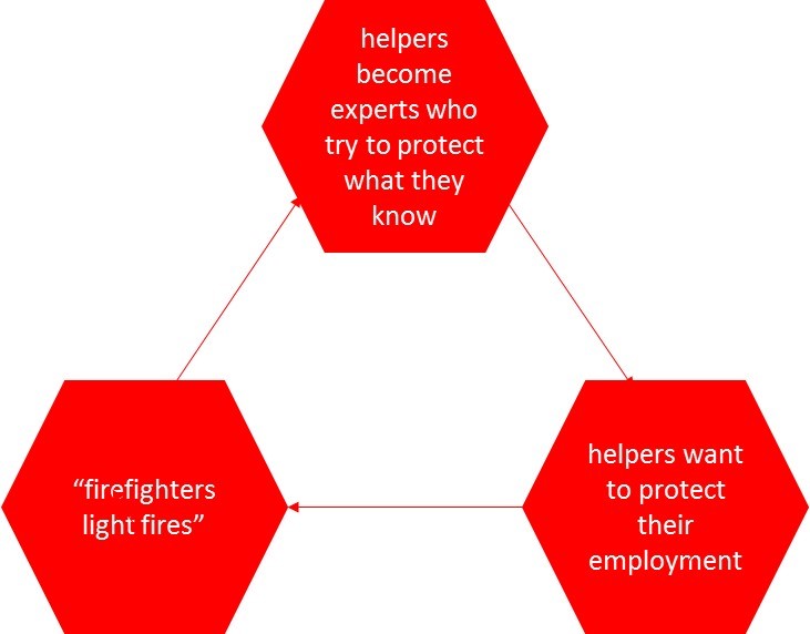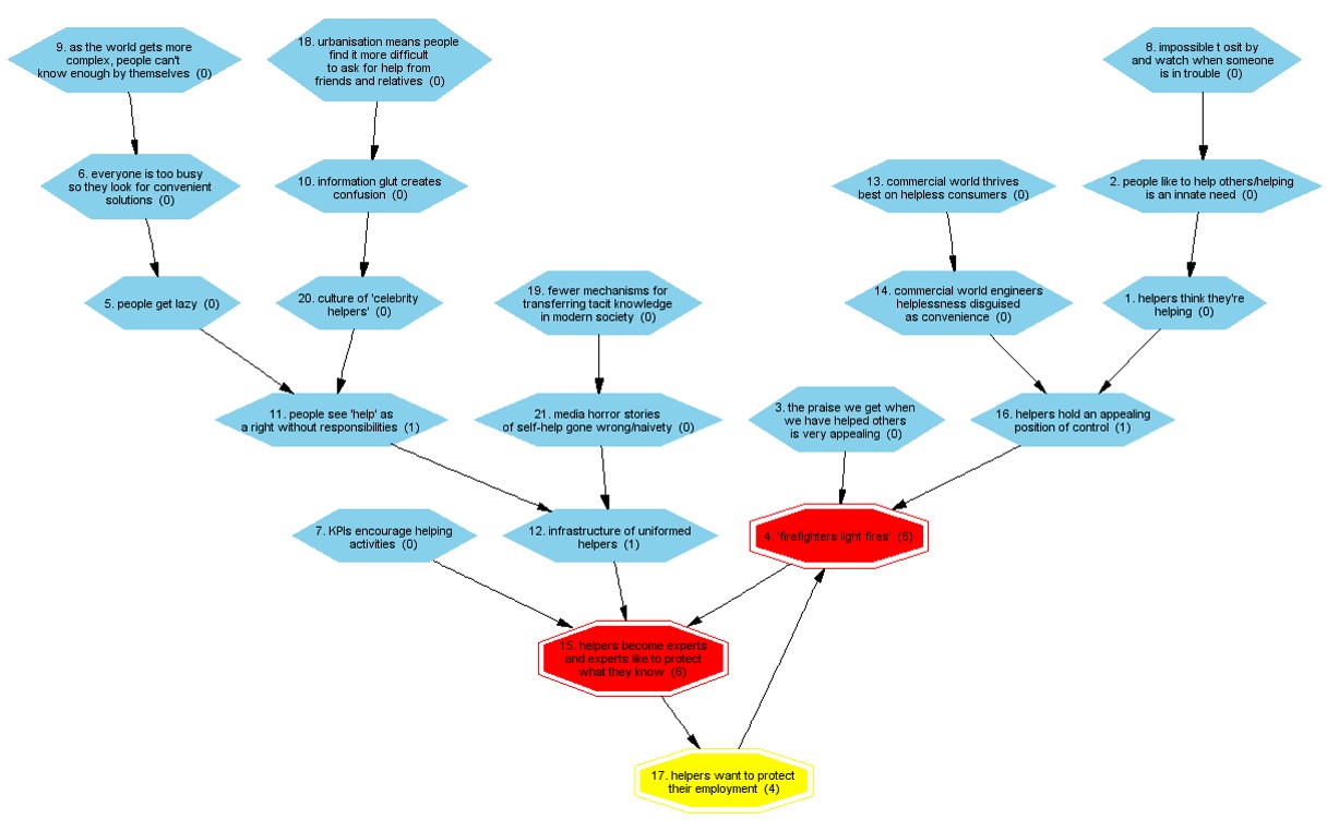 W Edwards Deming famously said that nearly all (he eventually ended up at 95%) problems come from the system rather than the individuals within it. No-one comes to work to do a bad job. It’s just that somehow, all that positive intent sometimes finds itself combining in ways that create unfortunate outcomes no-one could have expected. In other words, while the vicious cycle tells me that the helpers are the problem, the real problem is the emergent complexity of their combined actions.