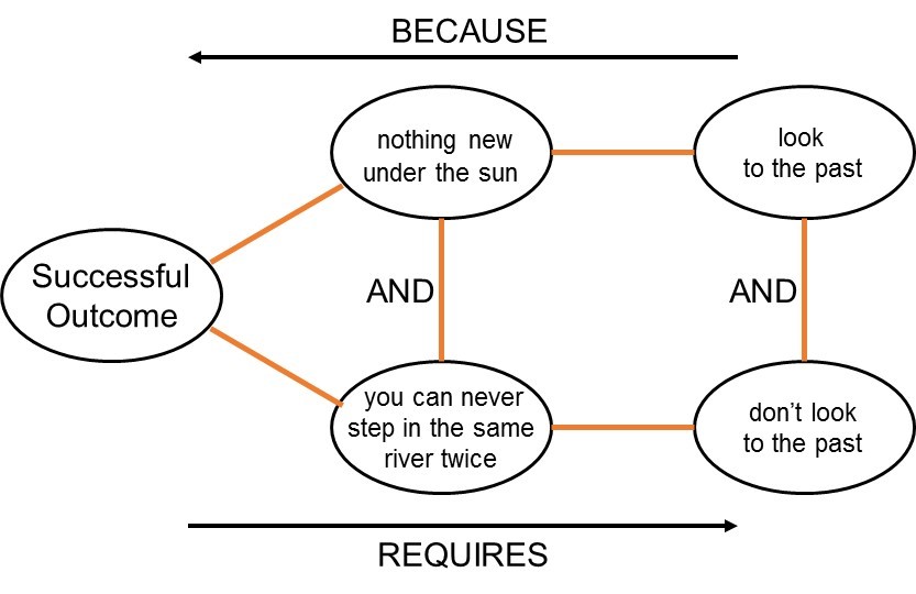 Looking at this picture as a whole, per its intended function, presents us with a variety of different ways to try and either solve the contradiction or challenge the underlying assumptions that connect each of the bubbles. We get a good clue from looking at the physical contradiction ‘look to the past and don’t look to the past’. We get another one by thinking about the left-hand side of the Map and what ‘successful outcome’ might mean. What’s the successful outcome we’re looking for that would come if both the aphorisms are true?