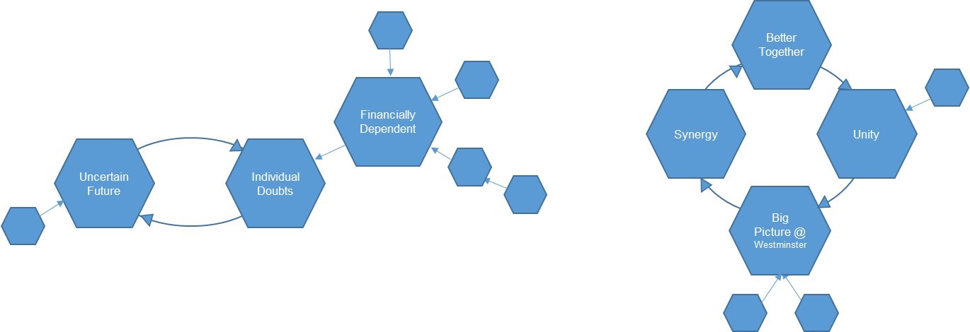 So, what about the No campaign? An equivalent search for reasons to say No was performed across the media, this time revealing a slightly shorter list of perceptions. Here’s what the final Perception Map looks like when we map the relationship between them: