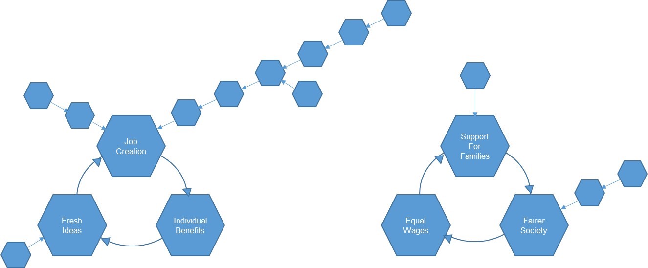 In the Yes campaign, a scrape of the various media commenting on the debate revealed 19 main reasons why Scots should vote ‘Yes’ to independence. Having compiled this list we conducted our usual ‘leads to’ analysis to try and make sense of the relationships between each of the reasons in order to establish what the main issues were. Here’s what the resulting Perception Map looked like:
