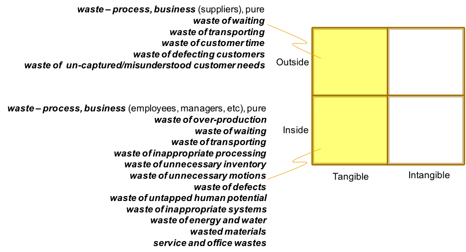 What the picture in effect says is that the Lean world has been really good at identifying the tangible – i.e. easy to measure – sources of waste inside and outside the boundaries of an organization, but that it has completely failed to tap in to all of the intangible – i.e. difficult to measure – things. Things like trust, loyalty, engagement and fear. In other words, the things that fall into the ‘unknowable’ category in W.Edwards Deming’s famous aphorism, ‘the most important numbers are unknown and unknowable’.